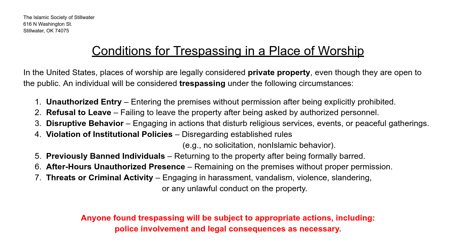 Subject: Authorization is required for all activities within the premises of the Islamic Center of Stillwater